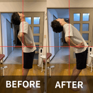 beforeでは、腰の痛みで身体を反ることができません。afterでは、痛みが改善し、可動域も広がっています。